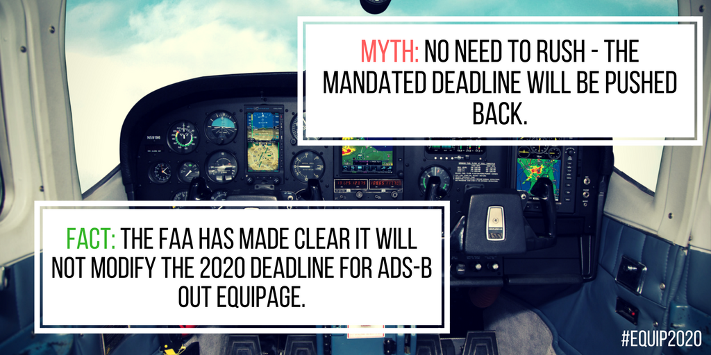 Fact: The Federal Aviation Administration (FAA) has made clear it will not modify the 2020 deadline for ADS-B Out equipage. FAA Administrator Michael Huerta recently stated, “We would like to see the industry equip with ADS-B Out as soon as possible. Let me be clear that the deadline for the mandate is set at January 1, 2020. It will not change.”